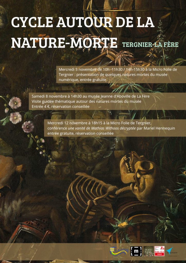 • Un autre événement aura lieu à la Micro Folie de Tergnier le Mercredi 5 novembre de 10h à 11h30 et de 14h à 15h30 en continu : présentation de quelques natures mortes du musée numérique (entrée gratuite)