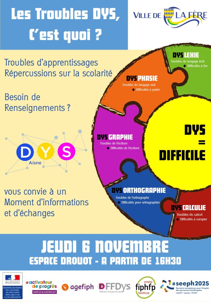 Dans le cadre de la Semaine Européenne pour l’Emploi des Personnes en situation de Handicap (SEEPH 2025), la commune de La Fère organise une soirée de sensibilisation aux troubles « DYS » le jeudi 6 novembre 2025 de 16h30 à 18h00, animée par Laurence Florin de DYS AISNE. Cette rencontre interactive permettra de mieux comprendre ces troubles d’apprentissage et de partager des solutions pour les accompagner au quotidien. Cet événement est un prélude à la mobilisation nationale du SEEPH 2025 du 17 au 23 novembre, culminant avec un forum programmé, sur notre commune, le jeudi 20 novembre 2025, de 9h30 à 12h et de 13h30 à 16h, à l’Espace Drouot. La participation de tous est encouragée pour favoriser l’inclusion et l’information.